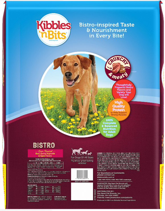 As part of our Chef’s Choice line of culinary-inspired foods, every bite of Kibbles ?n Bits Bistro Oven Roasted Beef Flavor dog food is bursting with a medley of bistro-style flavors. Thoughtfully prepared with the tastes of oven roasted beef, spring vegetables, and baked apple, this irresistible meal is made with high-quality ingredients that offer your dog complete and balanced nutrition. It’s a deliciously satisfying meal you can feel good about serving your dog every day!